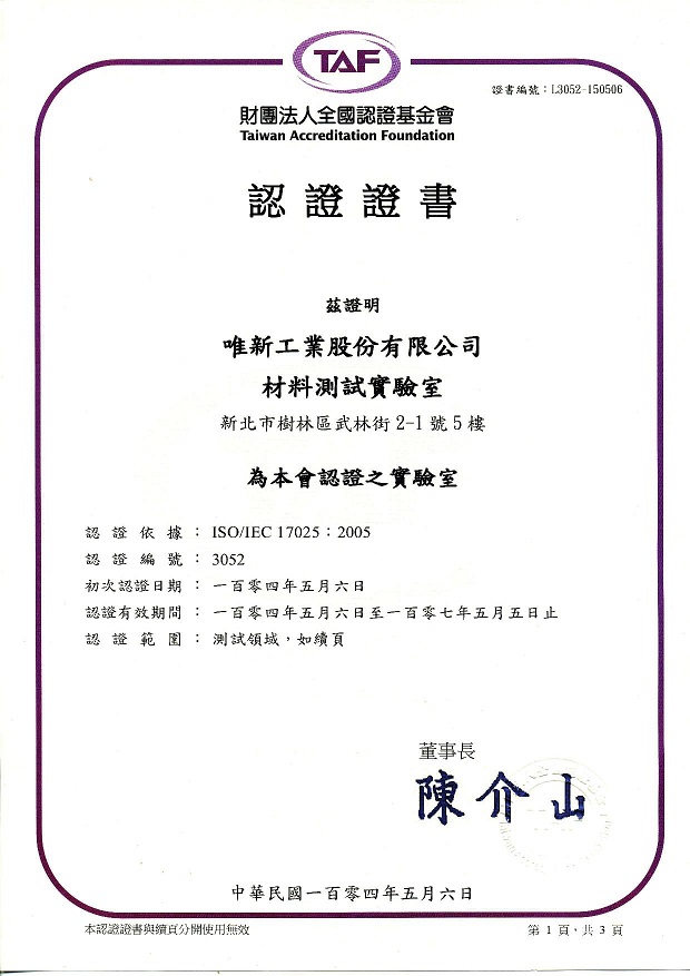 〈 唯新工業股份有限公司-材料測試實驗室〉已於 104年5月6日通過TAF的認可,成為TAF旗下的測試實驗室囉!!